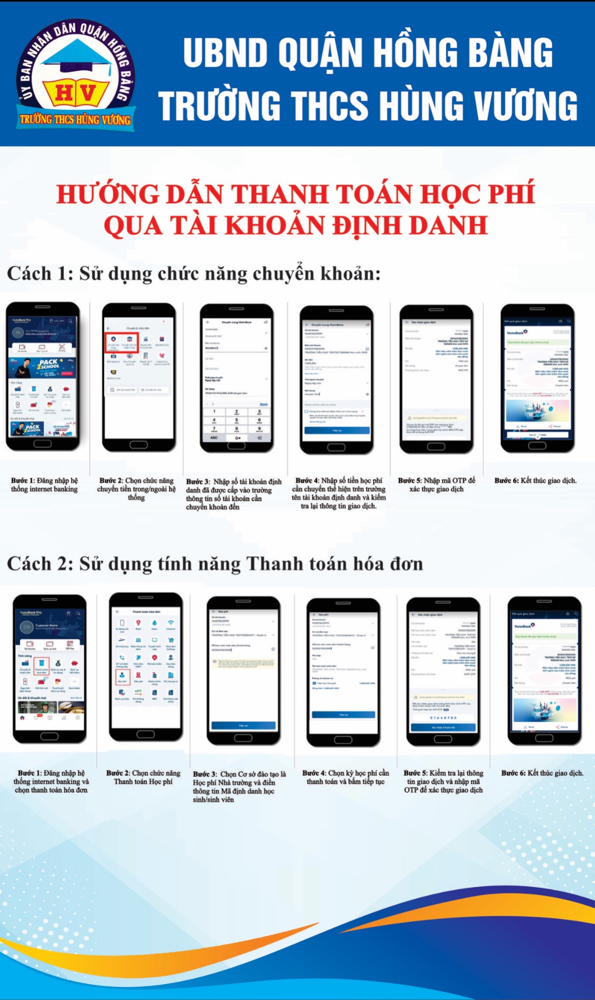 Thực hiện công văn và nhiệm vụ của nhà trường, trường THCS Hùng Vương phối hợp với ngân hàng để chuyển khoản ngân hàng cho phụ huynh học sinh chuyển khoản thu qua ứng dụng.